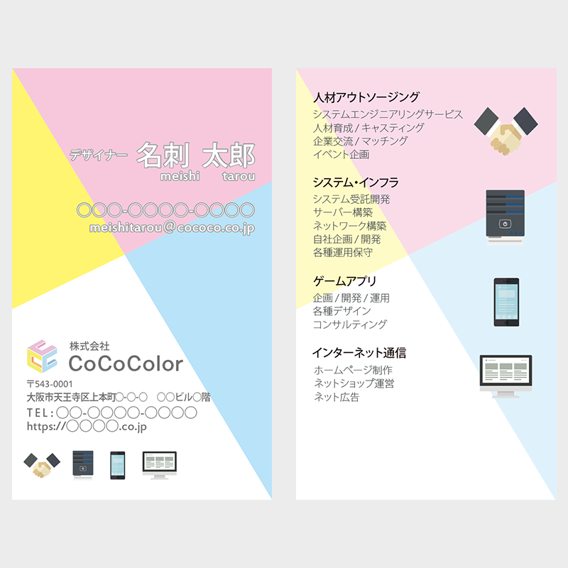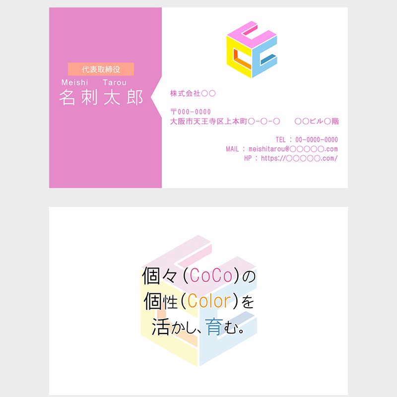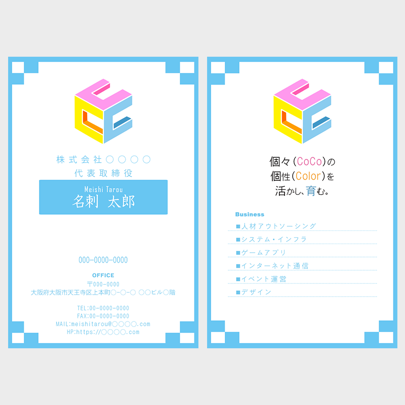 一般的な名刺デザインは勿論ですが、印象を強くするために似顔絵キャラを入れたりすることも可能です。 お客様の予算やイメージに合わせご提案いたします。